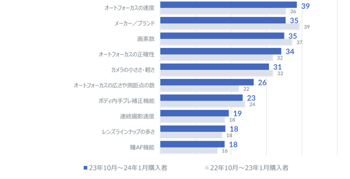 新製品には、被写体検出の種類の拡大や自動追尾などオートフォーカス機能の進化をうたったものが多く、ピント合わせが難しい鳥や飛行機など動きのある被写体の撮影にも対応できるようになっている。GfKが実施した調査で購入製品の重視点を聞いたところ、23年の結果では「ブランド」や「画素数」を上回って「オートフォーカスの速度」の回答が最も多かった(図2)。また、それ以外のオートフォーカス関連の項目(オートフォーカスの正確性、広さや測距点の数)も上位に上がってきており、直近のユーザーにおいてはオートフォーカス機能を重視・評価する傾向がみられた。