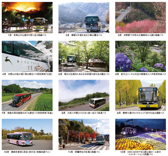当カレンダーでは、当社バスの走る沿線風景をバス専門誌等のカメラマンとして活躍する伊藤岳志(いとうたけし)氏の写真で紹介いたします。今回は「奈良の四季と奈良交通バス」というテーマのもと、季節のイベントや花々を背景に当社のバスを捉えた写真を使用して作成いたしました。四季の移ろいを感じられる内容となっておりますので、ぜひお買い求めください。