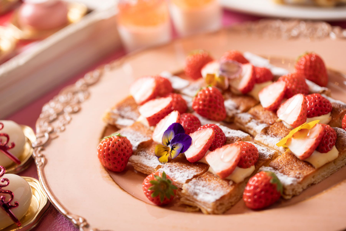 ■スイーツ(全18種類):ドレスドールショートケーキ/いちごレモンのタルト/ストロベリーパイ/カヌレタワー/ルビ―ショコラとベリオットムース/ライチとストロベリーのムース/いちごのガトーオペラ/いちごとヨーグルトのパンナコッタ/いちごプリン/チョコレートとチェリーのベリーヌ/いちごとピスタチオのベリーヌ/いちごのマスカルポーネムース/スティックワッフル/いちごチョコレートパウンドケーキ/いちごのクレープシュゼット/いちごマカロン/いちごと白ワインゼリー/SDGsフレッシュいちご食べ放題(形が規格外のため通常は提供されないもの)