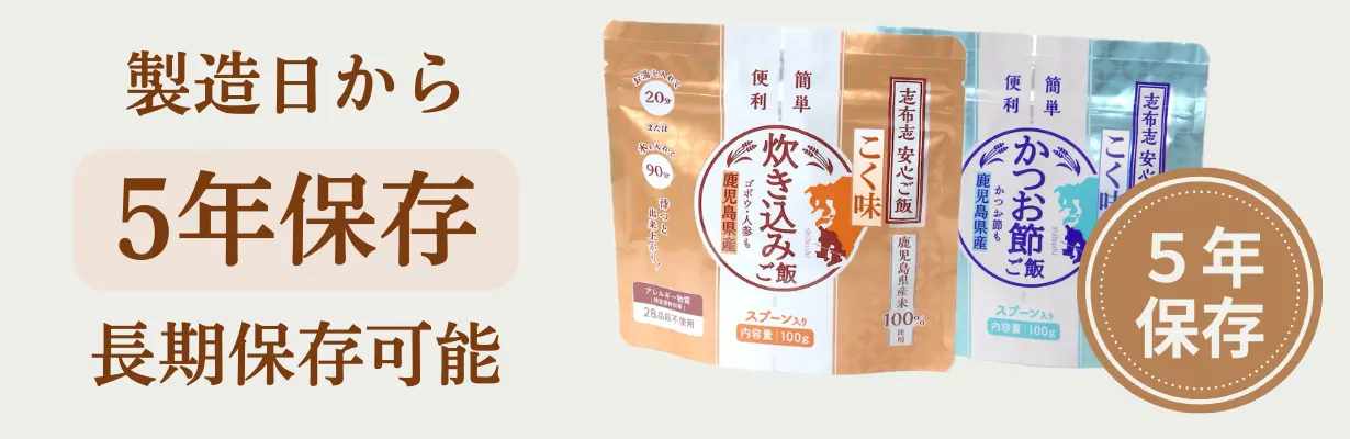 志布志安心ご飯のアルファ化米は保存期間5年と長期保存が可能です。