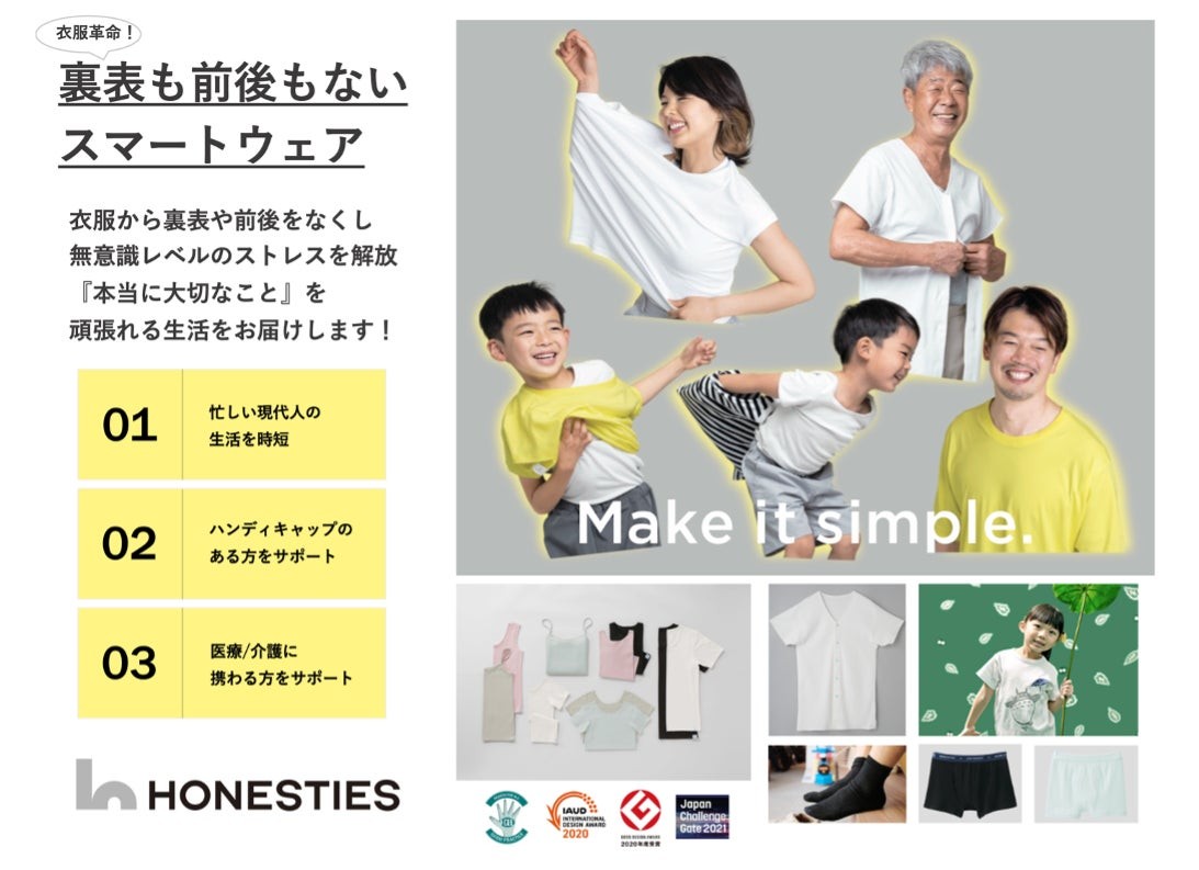 オネスティーズは裏表・前後のない独自のデザインのアンダーウェア(Tシャツ、パンツ、靴下など)を企画・販売しています。衣類の着脱に関するステップは想像以上に複雑です。裏表を認知し、正しい面を表にして、正しい向きに持ち変えて体を通し、正しく着られているかを確認して着衣は完了します。脱衣後に裏返ってしまった衣類は、再び正しい面を表にするステップを経て洗濯されます。家事を行う人はもちろんのこと、例えば介護を要する高齢者の場合、介護する側が1枚ごとにこれらのステップを踏んでいくこととなります。裏表・前後のない衣類の普及は、大量の洗濯物が発生し、スムーズな着脱が求められる介護や医療での現場の負担を大きく軽減させ、サービスの質の向上に寄与することが期待されます。また、全盲や発達障害などのハンディキャップを持つ方が、「自分で自分のことをできる」ように背中を押し、自尊心を育て、その家族も自立行動を見守ることができます。