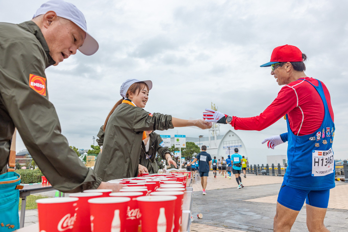 「ラッキー給食」は、ランナーの方々に楽しみながらゴールを目指してもらうため、地元横浜、神奈川の銘菓やおすすめ食品を用意。どこの給水所で何が食べられるかは当日のお楽しみになっており、“食べられたらラッキー!”と思えるところから「ラッキー給食」と呼ばれています。今年は「ラッキー給食総選挙」が行われ、第1位が「コカ·コーラ」、第2位が「タブレットショコラ」、第3位が「横濱ハーバー『ダブルマロン』」という結果になりました。