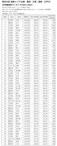 ・10位までに江東区の湾岸エリア「有明」「豊洲」「辰巳」「東雲」の4ヶ所がランクイン。