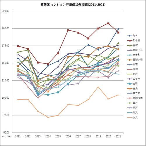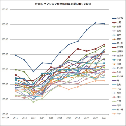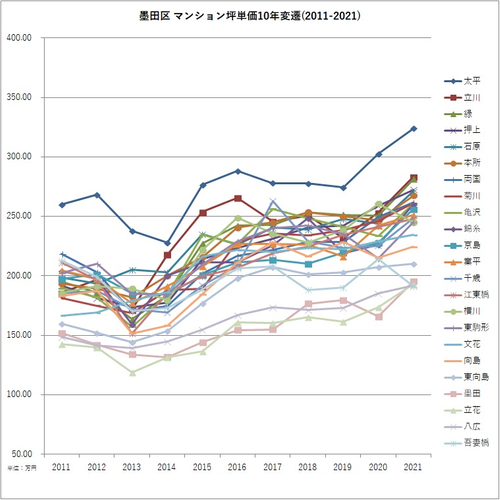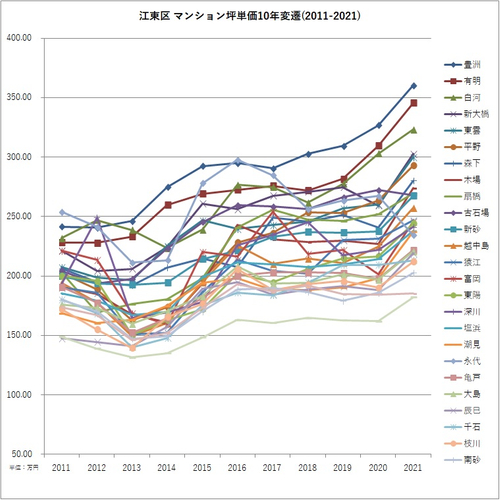 2011年と2021年のマンション坪単価より騰落率を算出。