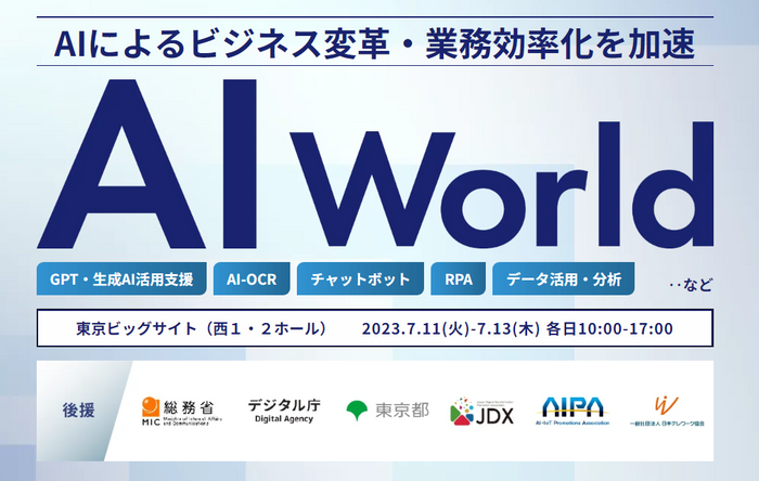 AIによるビジネス変革のための展示会『AI World』が初開催。ChatGPT・生成AI活用、AIチャットボット、データ解析などAIソリューションが出展。AIをビジネス活用するための絶好の情報収集の場となります。