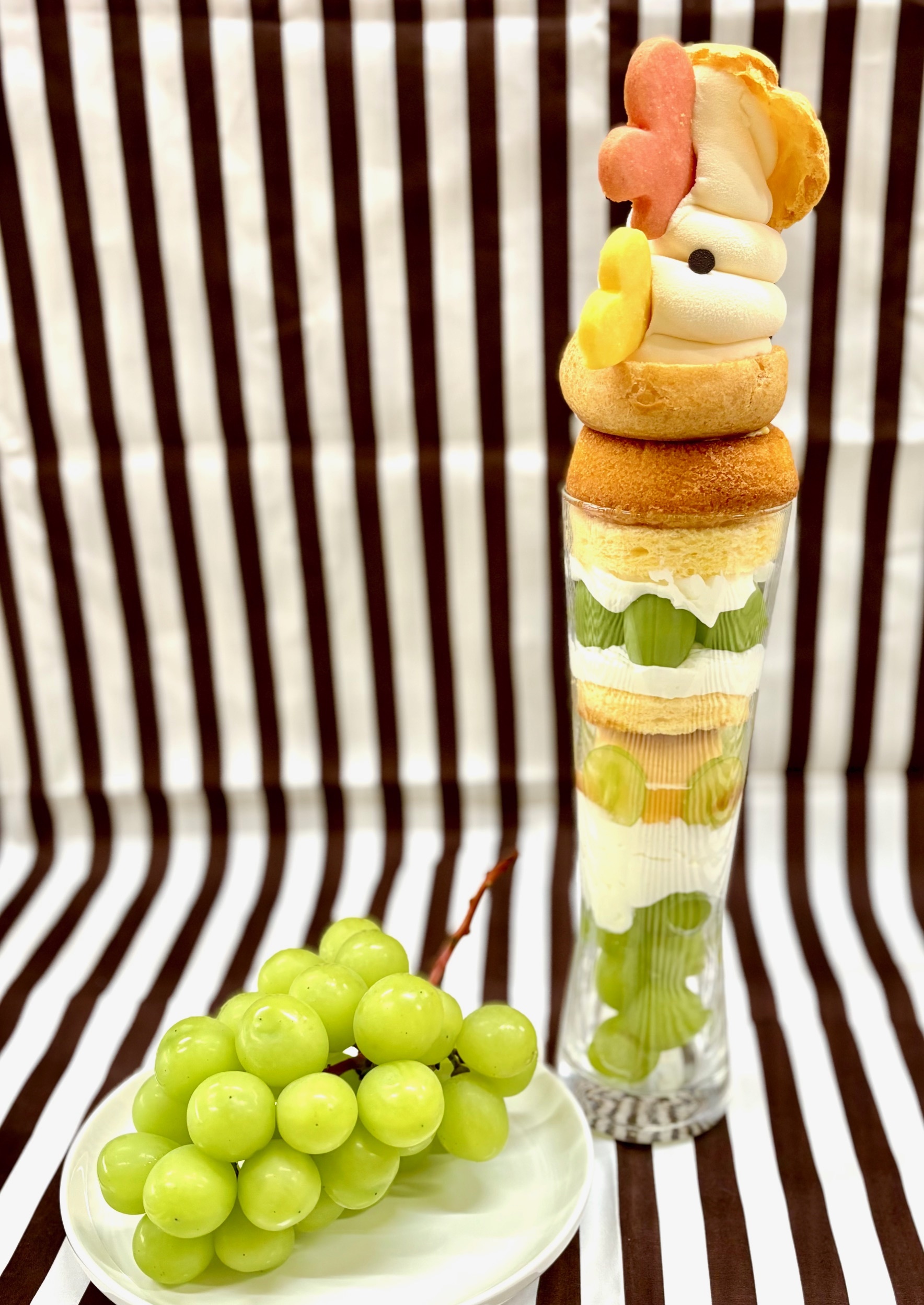 前回のメロンパフェに引き続き、季節の果物とボリュームにこだわったものにしたい!という思いからシャインマスカットを使用したパフェに。