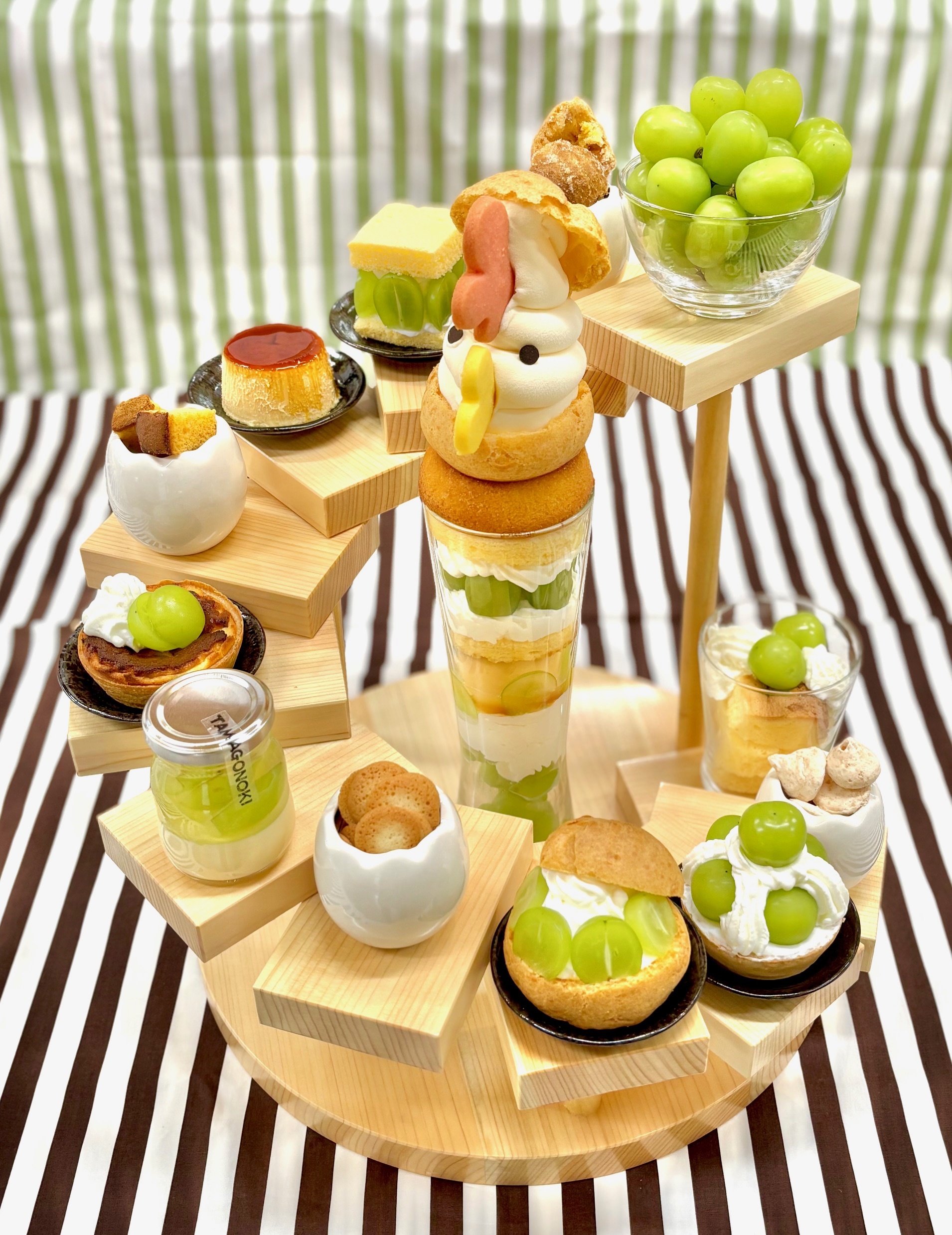 アフタヌーンティーセットから着想を得たフルアーマーVerですが、シャインマスカットをたまごの樹のお菓子とともに味わっていただくべく、試行錯誤していくうちにとてもボリューミーに!