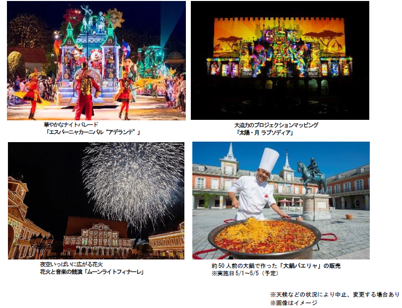 4月29日(木・祝)~5月5日(水・祝)は、ナイター営業を連日開催します。ナイトパレード、プロジェクションマッピング、花火へと続くナイトスペクタクル「エスティバル フェスティバル」や大鍋パエリャの販売を実施します。昼も夜も一日中盛りだくさんのイベントをお楽しみください。さらに、16時以降お得に楽しめる「ムーンライトパスポート」を販売します。