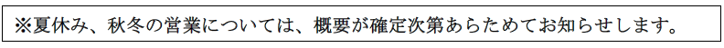 3月20日(土・祝)~11月27日(土)の土曜日および一部の日曜日等(GW、夏休みは除く)