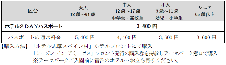 「ホテル志摩スペイン村」「シーズン イン アミーゴス」にご宿泊の方は、当日から翌日までの2日間、テーマパークをお得に楽しめるホテル2DAYパスポートをご購入いただけます。