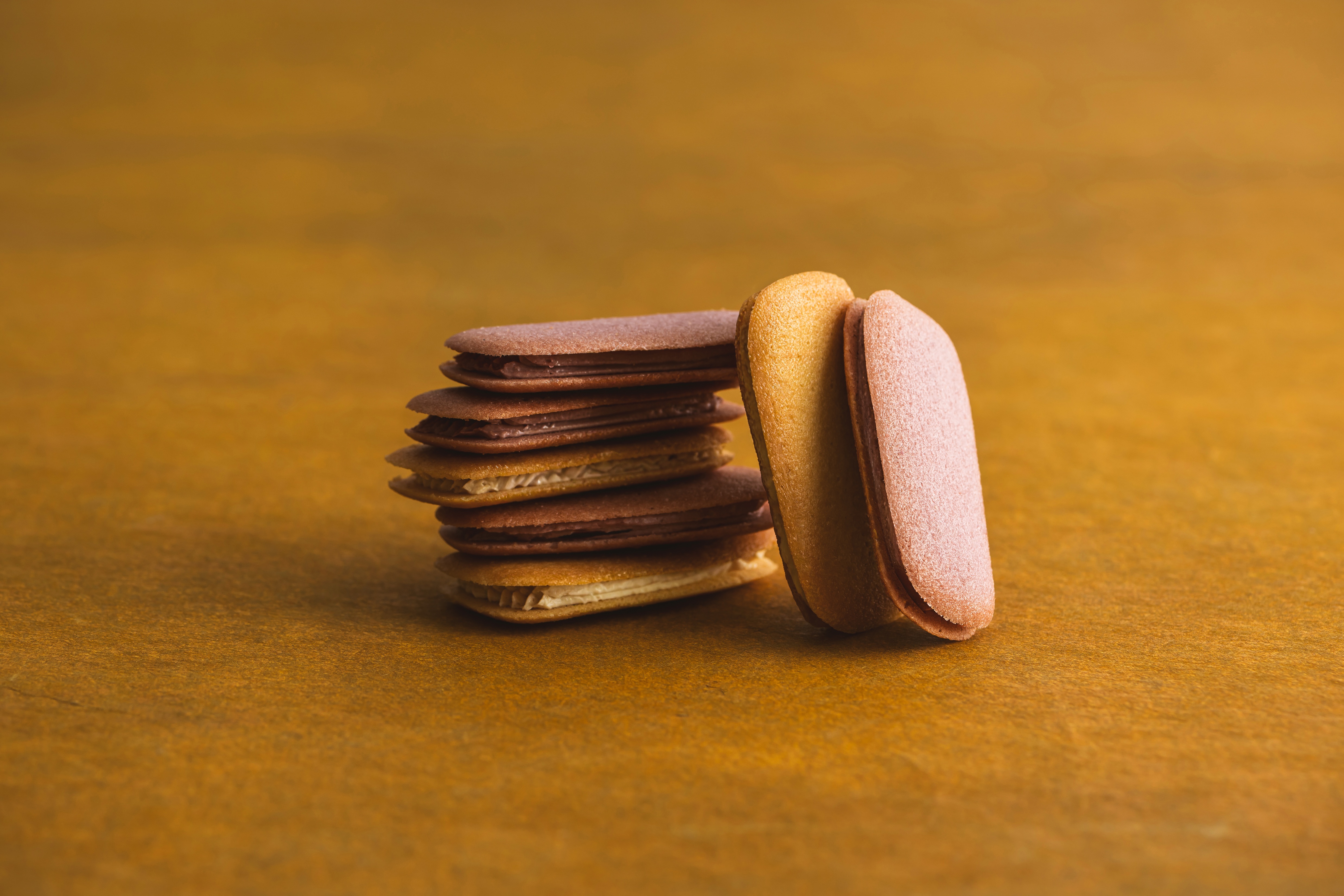 芋蜜を使った、軽やかなラングドシャ生地に、芋蜜クリームをのせ、さらに中央にも芋蜜を閉じ込めて、サンドしました。優しく華やかな甘さと香りの余韻が広がります。