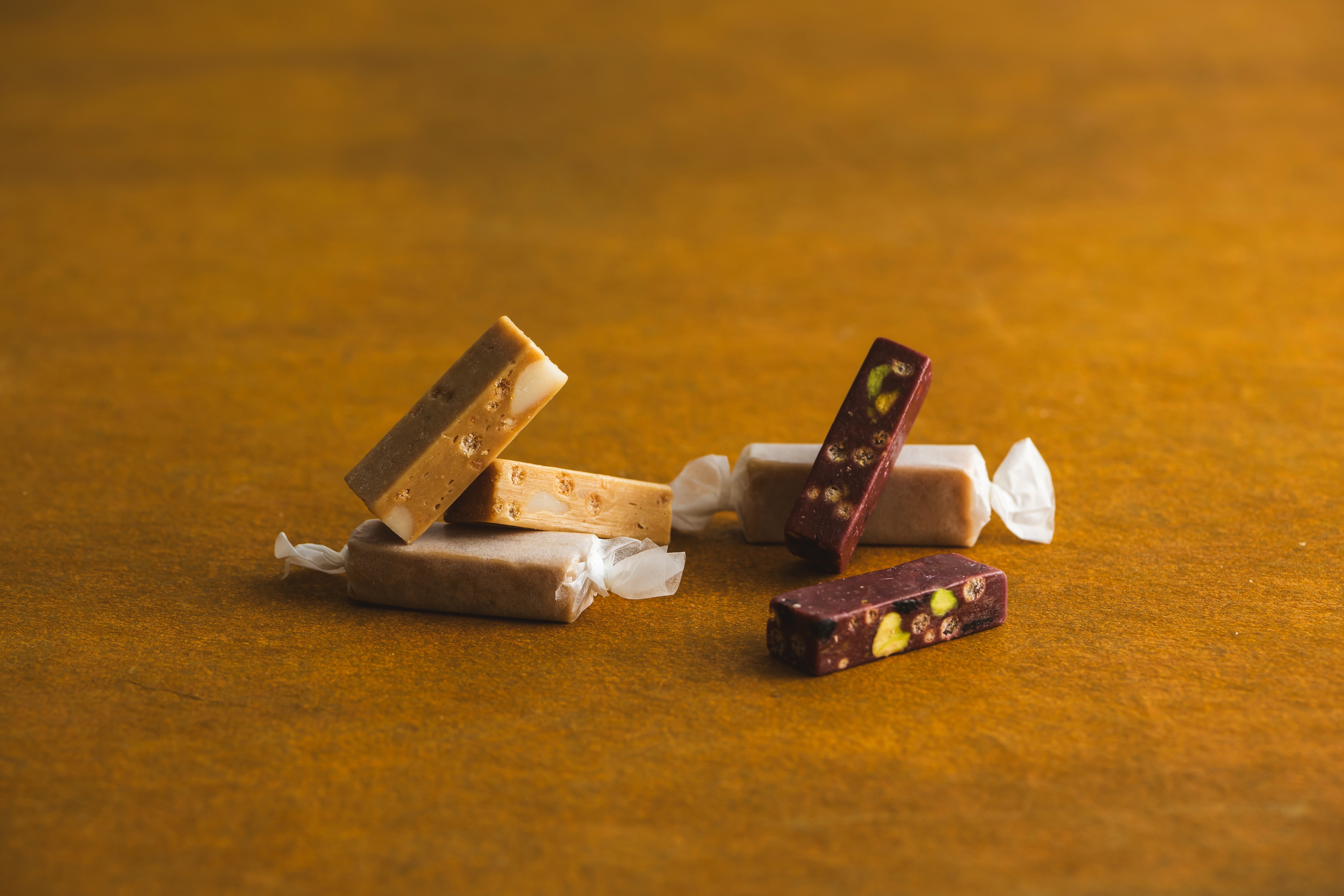噛みしめるほどに広がる芋蜜の深い甘みと芳ばしさ。安納芋、紫芋、それぞれの芋蜜に合う素材を使用し、歯切れの良いヌガーに仕立てました。