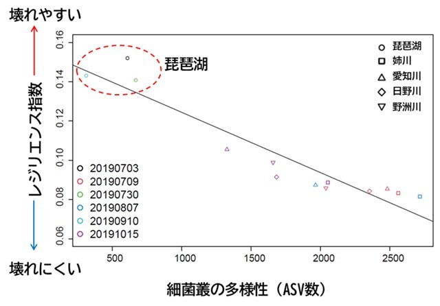 また、その適用例として、琵琶湖とその流入河川である姉川・愛知川・日野川・野洲川に開発した手法を適用したところ、生態系間でその壊れにくさは大きく異なり、琵琶湖が最も壊れやすい(=レジリエンスが低い)との診断結果を得られました(図2)。琵琶湖に流入する大小さまざまな河川にこの技術を適用すれば、たとえば琵琶湖の西側と東側でどちらの河川生態系が壊れにくいかの診断・評価が可能であると言えます。