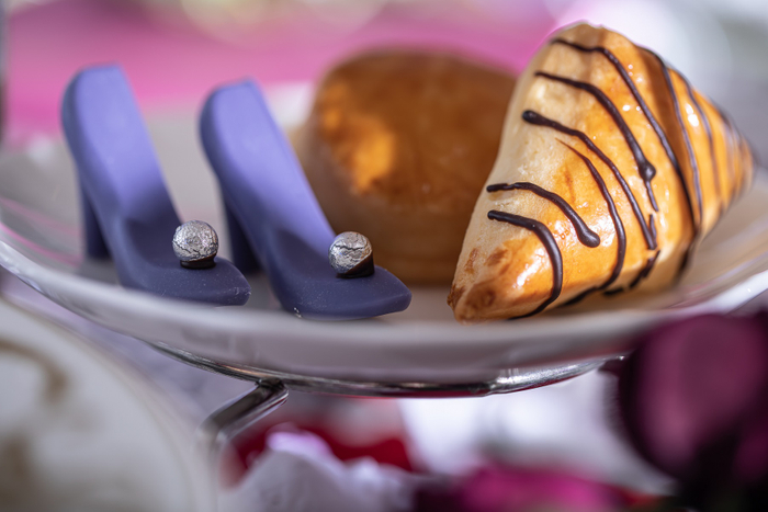 初めに登場するのは、濃いブルーのドレスをまとった“ダークプリンセス”イメージのドレスケーキ。ふんわりとしたシルエットのドレスは、4枚のスポンジでフレッシュいちごと北海道産生クリームをサンドした、パティシエ特製ショートケーキです。そして三段のスイーツスタンドには、バンパイアをイメージしたオペラケーキ、ティアラやブーケ、ヴィランズカラーのマカロン、ヒールチョコレートなどのプチガトーをご用意。ブラックサンドウィッチやキッシュなどの軽食、コーヒー・紅茶のフリーフローとともにご堪能いただけます。“ヴィランズ”をテーマにしたダークプリンセスの世界をお楽しみください。