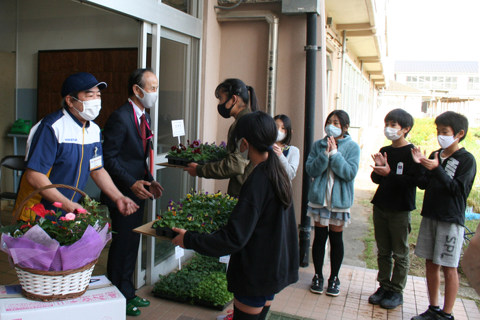 本年度は、新型コロナウイルスの感染拡大防止のため、贈呈式は執り行わず2020年10月16日(金)に千葉市立真砂第五小学校を訪問し、感染対策を十分に取った上で、花の苗300株を直接手渡しさせていただきました。