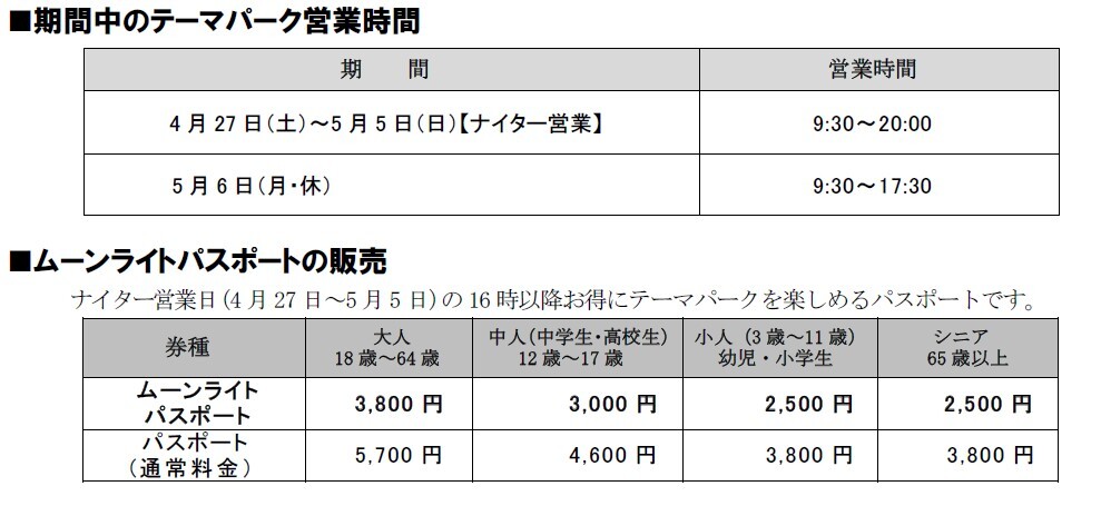 志摩スペイン村では、ゴールデンウィークの4月27日(土)~ 5月5日(日)の期間、ナイター営業を実施し、華やかなナイトパレードと大迫力の花火が夜のパークを華やかに彩ります。陽気で明るいエンターテイメントや大鍋パエリャの販売など、昼も夜も夢中になれるイベントが盛りだくさん。さらに、16時以降お得に楽しめる「ムーンライトパスポート」も販売します。