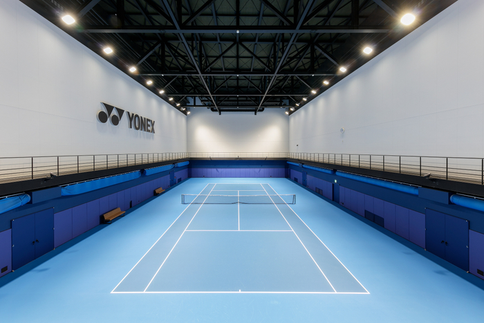 新研究開発施設は25,400㎡の敷地内に3階建ての研究開発棟を備えています。実際の多様なプレー環境でプレーヤーの動作や打球をより精密に分析するため、最新鋭の解析機器を常設した研究用コートに加え、可変式アリーナ(バドミントンコートの場合8面、テニスの場合2面)、テニス世界大会を想定した4種類のサーフェス(表面)の屋外テニスコートも設置しました。また、トレーニング施設等、トップレベルのトレーニングキャンプにも対応できる設備を併設しています。
