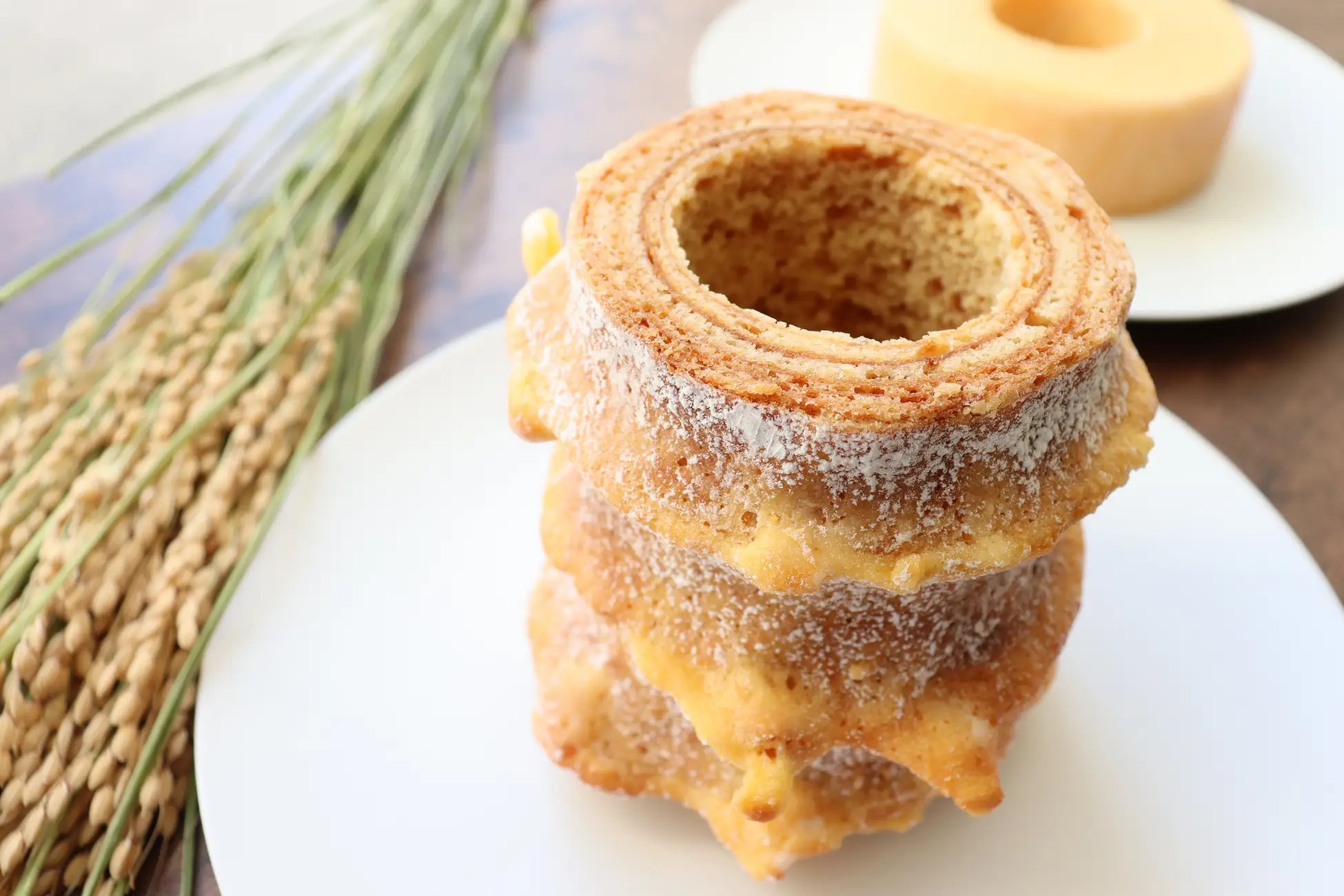 噛むほどに美味しい、ハードな食感の玄米バウムクーヘンです 。玄米ならではの香ばしさと、自家製米粉の滋味深い味わいが特徴。グルテンフリーの概念を覆す、噛み応えと満足感のある一品です