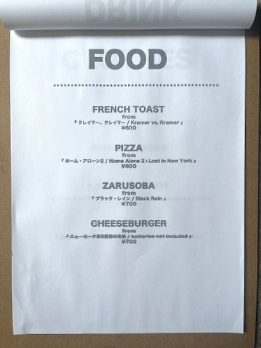 同店では映画に登場する食べ物や飲み物を再現したメニューを楽しむことができます。名作『クレイマー、クレイマー』でダスティン・ホフマンが作ったフレンチトースト(600円)など。他にも『ブラック・レイン』で高倉健が食べたざるそばなど、映画ファンにはたまらないメニューがそろっています。