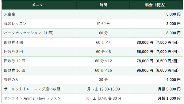 さらに、Zoomを使ったオンラインAnimal Flowレッスンも開講中。毎週火曜・土曜の朝7:00〜7:30と夜21:00〜21:30の1日2枠で、全国どこからでも参加可能です。店舗への入会は不要で、月額1,000円(税込)から始められるため、Animal Flowを気軽に体験してみたい方にも最適です。お申し込みは公式LINEよりお受けしています。