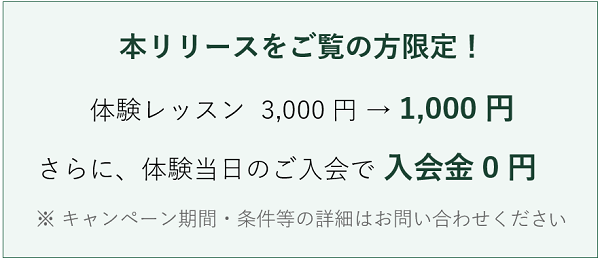 体験レッスンが通常3,000円 のところ1,000円で受けられます。さらに体験当日のご入会で入会金無料になります。