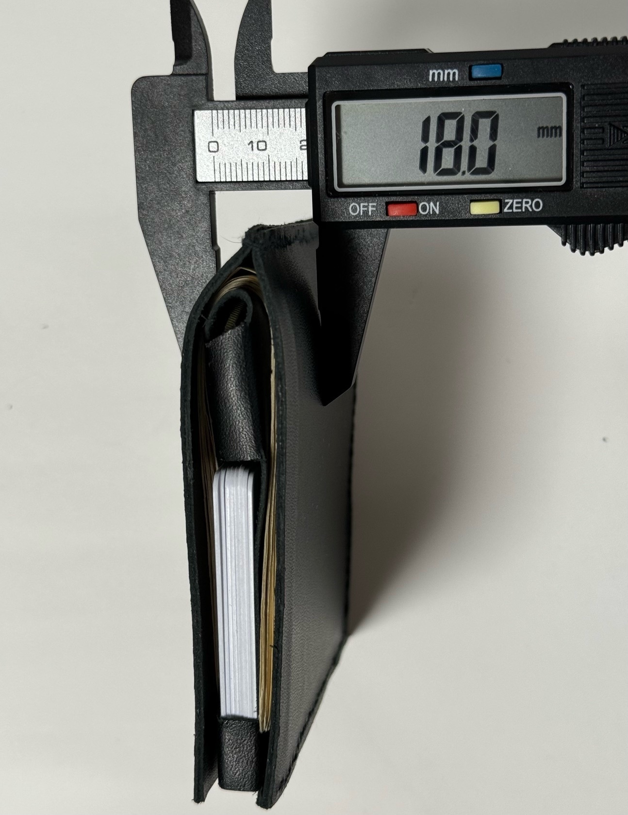 幅90ミリ・長さ94ミリ・厚さ8ミリ(未収納時)・重さ33gと、ワイシャツの胸ポケットにも入る最小クラスながら、紙幣12枚・硬貨15枚・カード9枚収納時でも厚さ18ミリに収まり、特に従来のコンパクトウォレットの弱点を克服し、自然で快適な使用感が特長です。