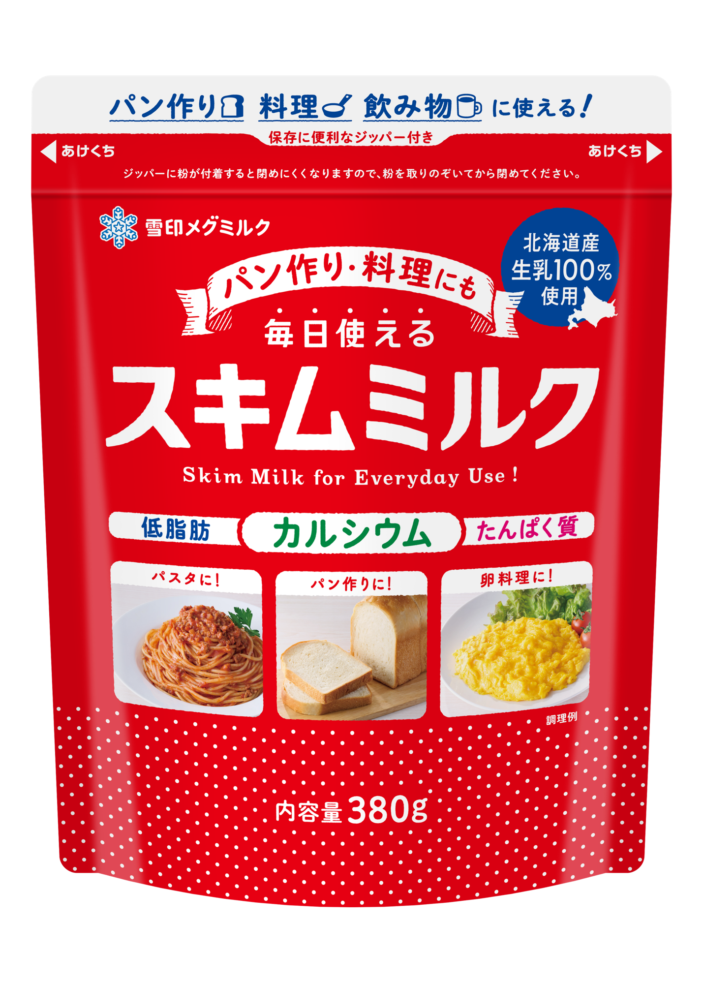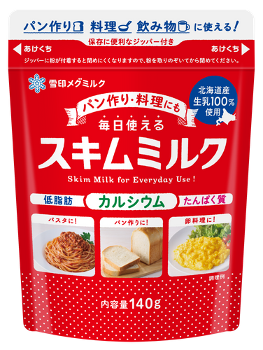 スキムミルクは、カルシウムやたんぱく質を補うことができる食品です。北海道産の生乳を100%使った雪印メグミルクの「毎日使える スキムミルク」(140g、380g)は、大さじ1杯(約8g)あたりカルシウム96㎎とたんぱく質2.9gを摂取できます。当商品は、ミルクの風味が穏やかであるため、料理の味を損なわずに使用できます。例えば、手作りパンやホワイトシチューの他に、ひき肉料理や卵料理、お好み焼き、またパスタやポテトサラダの仕上げなど、ミルク味の料理以外にも手軽に加えていただけます。
