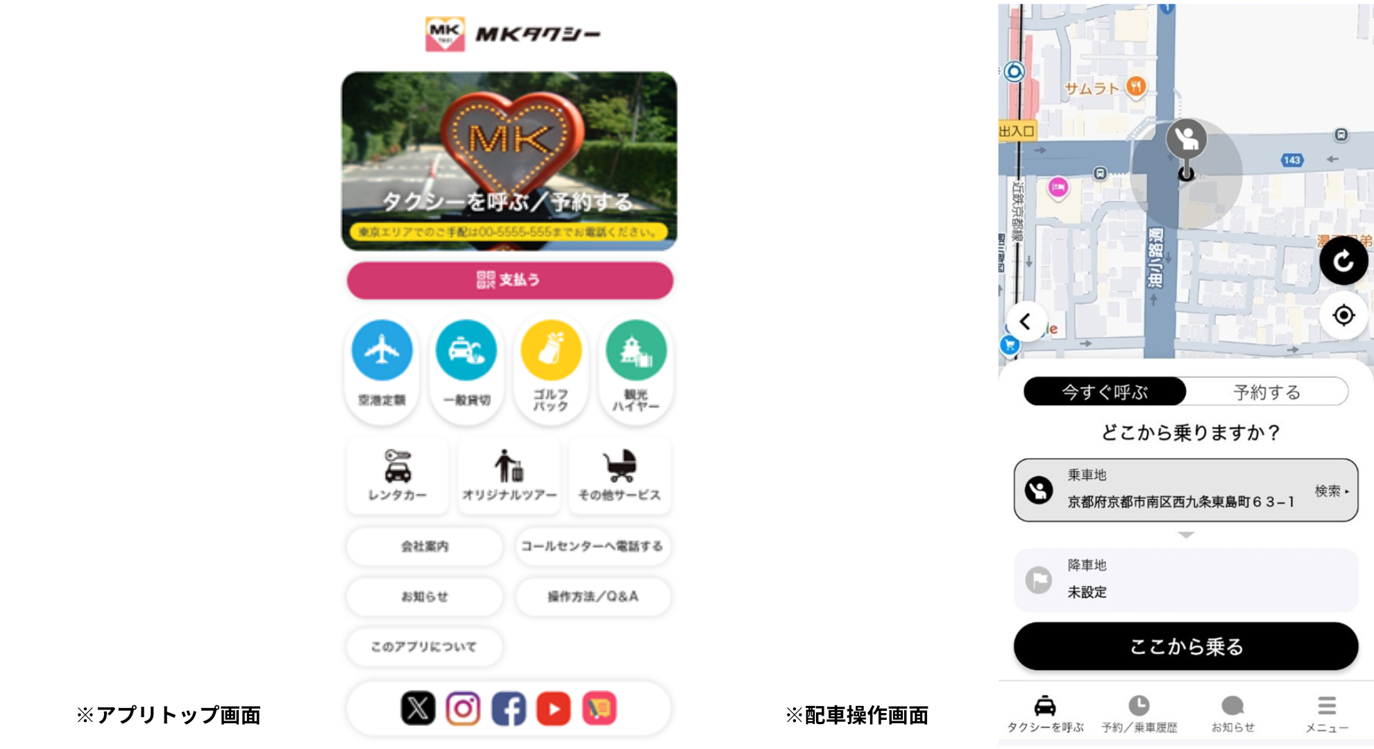 MKタクシーを指定して呼べるのは「MKスマホ配車」アプリだけ。タクシーだけでなく空港定額やハイヤー貸切、レンタカー予約も。