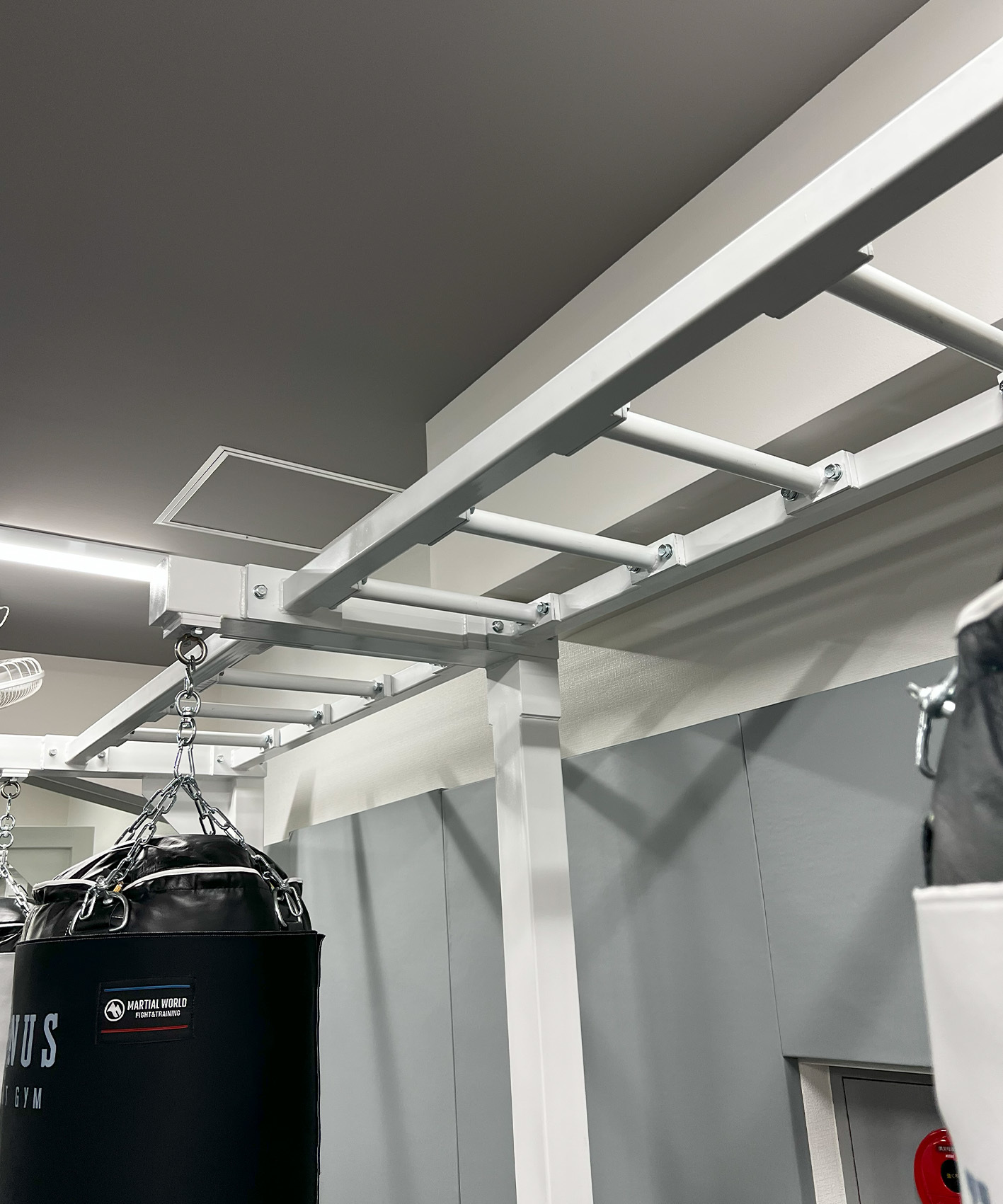 設備も充実しており、床、壁マットはマーシャルワールドジャパンのPANELMATを使用し、サンドバッグフレームも吊るせるだけでなく、雲梯、懸垂バーも一体型としたことでフリースペースを有効活用しています。またサンドバッグは新品だとフィットネス目的の女性は痛いと感じることがあると、新商品の「巻けるんです」を全てに巻くなど、拘りが詰まった総合格闘技ジムとなっています。