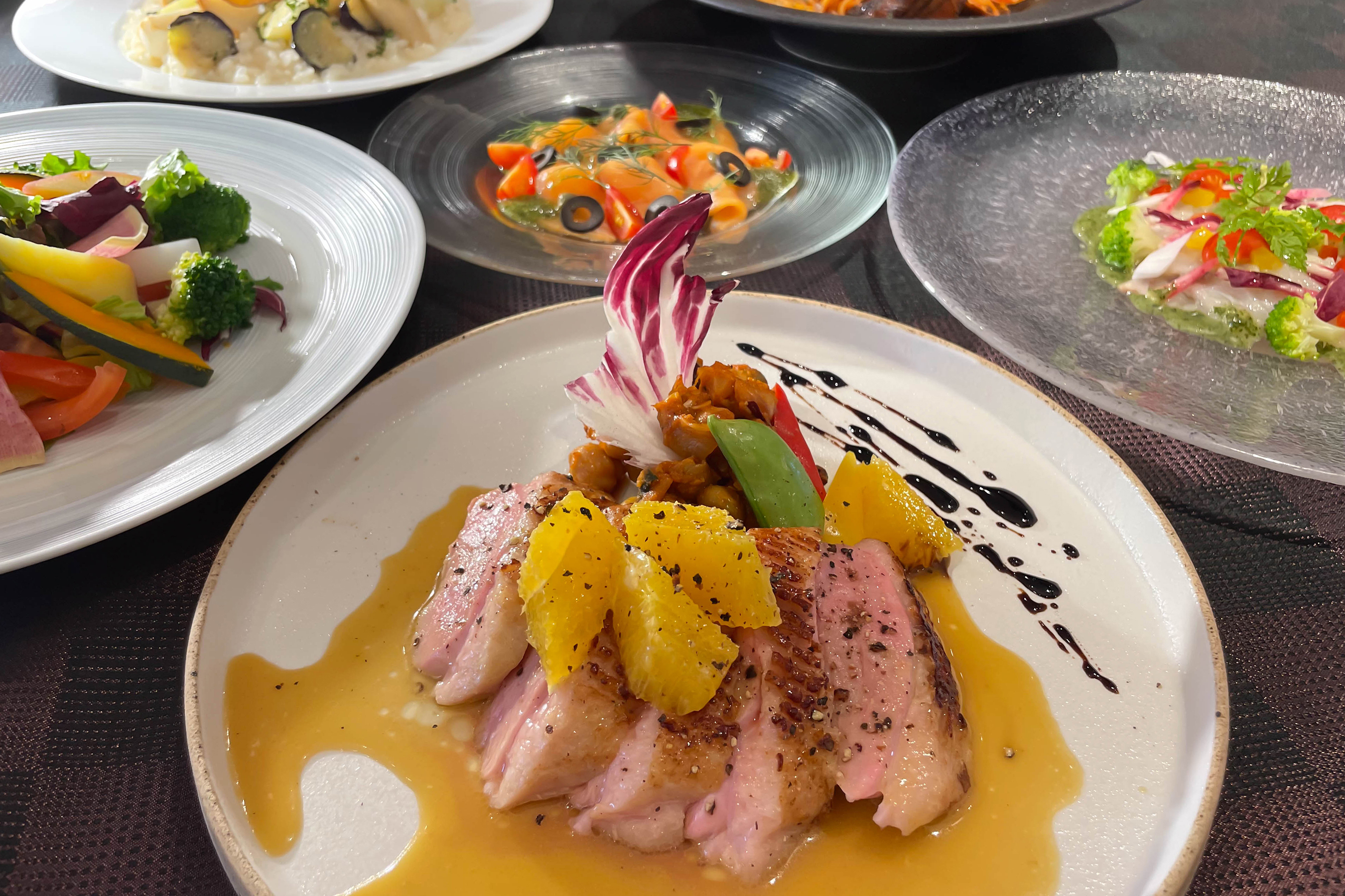 レストラン「THE R9 DINING」では、「フレンチをもっと身近に、ワインをもっと気軽に」をコンセプトとしており、地元の食材を活かした本格的なフレンチとイタリアンを中心に、和・洋・中の幅広いメニューをご提供いたします。ランチタイムにはカジュアルに料理をお楽しみいただき、ディナータイムにはワインとともに本格フレンチコースをご堪能いただけます。