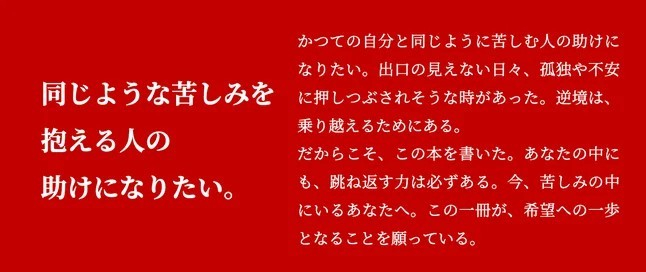 だからこそ、この本を書き上げました。あなたの中にも、跳ね返す力は必ずあります 。今、苦しみの中にいるあなたへ。この一冊が、希望への一歩となることを願っています 。