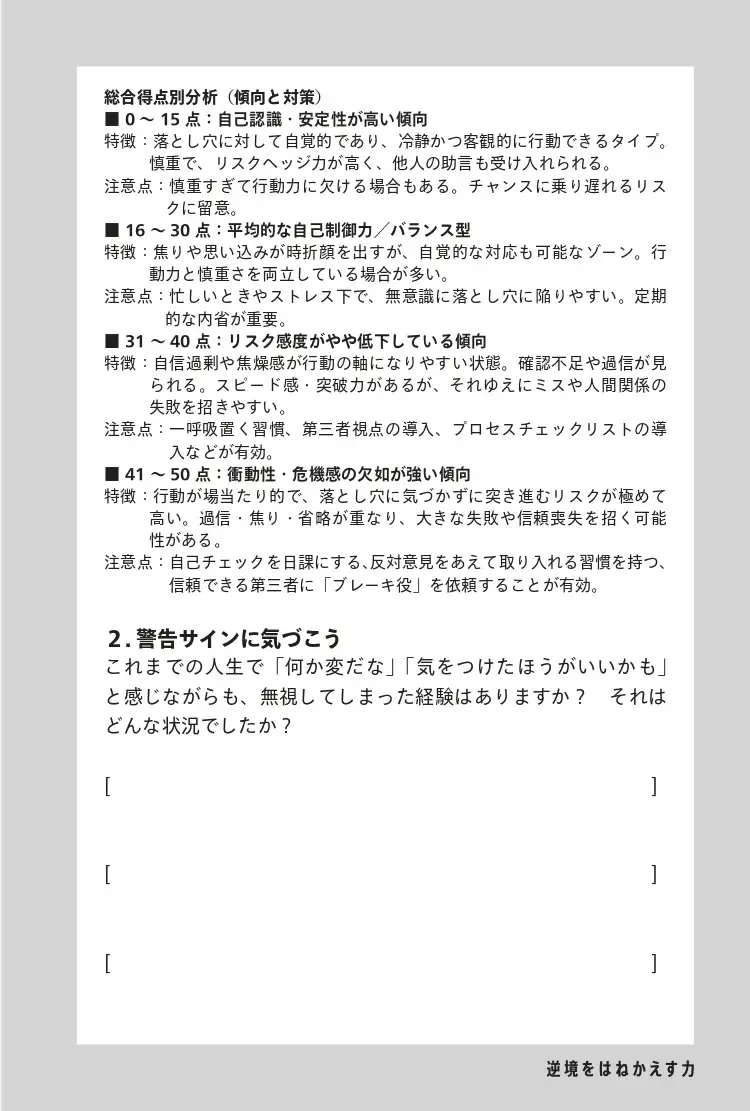 が明確になります。特に31点以上のスコアを持つ人は要注意。危機感の薄さや過信、焦りから、大きな失敗を招く可能性が高いことがわかっています 。
