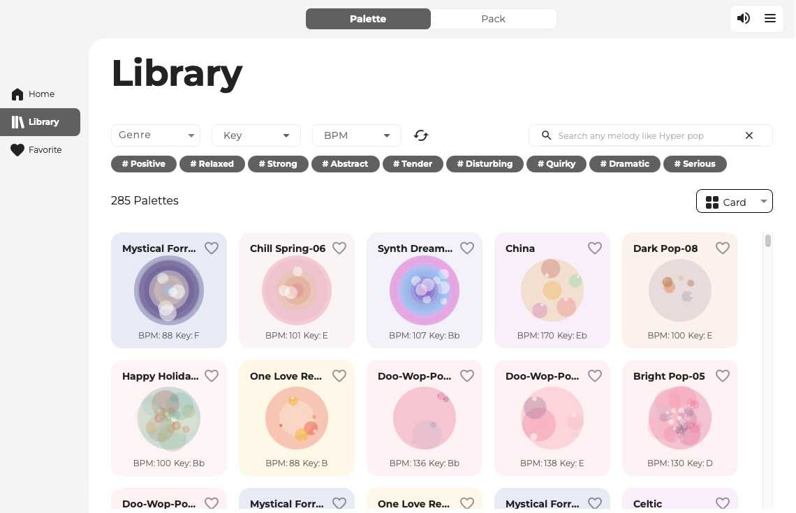 『Melody Flip』は、その思想を具現化したソフトウェアです。オーディオ化された楽曲ファイルを読み込むことで、曲の構造、BPM(一分間の拍数、テンポ)、調(キー)、コード進行、ジャンル、ムードなどを解析。解析結果と約300種類に及ぶパレット(※)を組み合わせることで、オリジナリティあふれるメロディーのアイデアを生成して提案します。