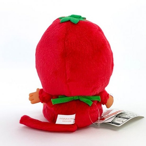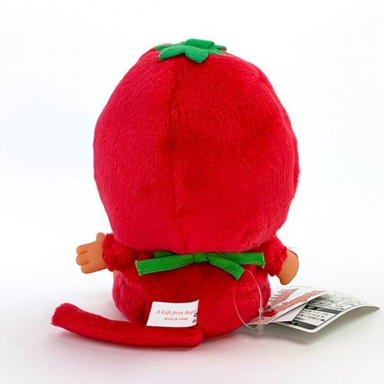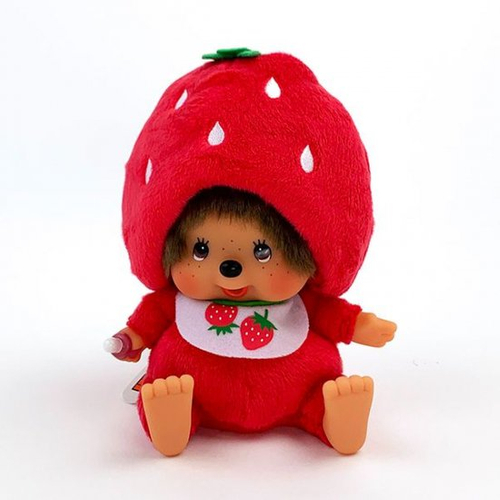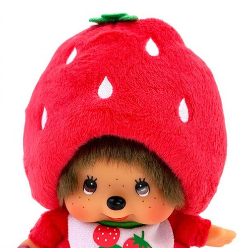 まず最初はイチゴモンチッチから。イチゴのコスチュームに身を包んだモンチッチです。帽子のてっぺんにはイチゴのヘタが付いており、赤ちゃんスタイにもイチゴが書かれています♪