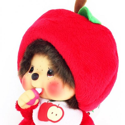 つづいてはリンゴのモンチッチです。頭にはリンゴのヘタが付いていて、まんまる帽子がとにかく可愛い!こちらもイチゴのモンチッチ同様、スタイにリンゴが描かれています。