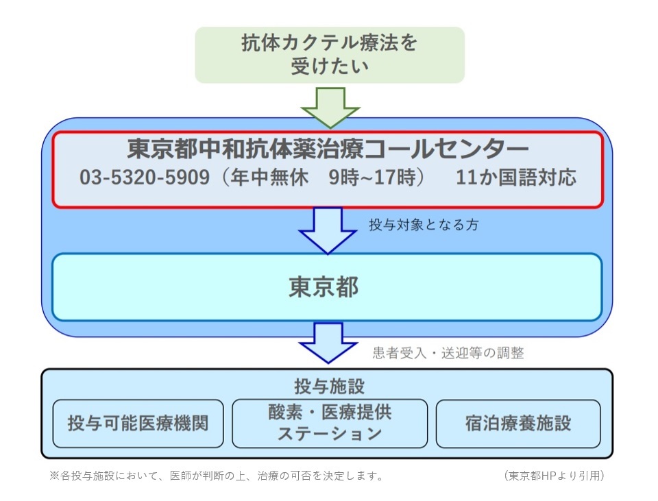 抗体カクテル療法とは、新型コロナ罹患者さまご本人が治療を希望する場合、「東京都中和抗体薬治療コールセンター」に連絡をし、東京都の調整後、指定された日時に投与可能医療機関で、治療を受けることができる治療方法です。国際自動車は東京都からの委託により、罹患者さまのご自宅から投薬可能医療機関、また経過観察後のご自宅までのお送りを対応いたします。