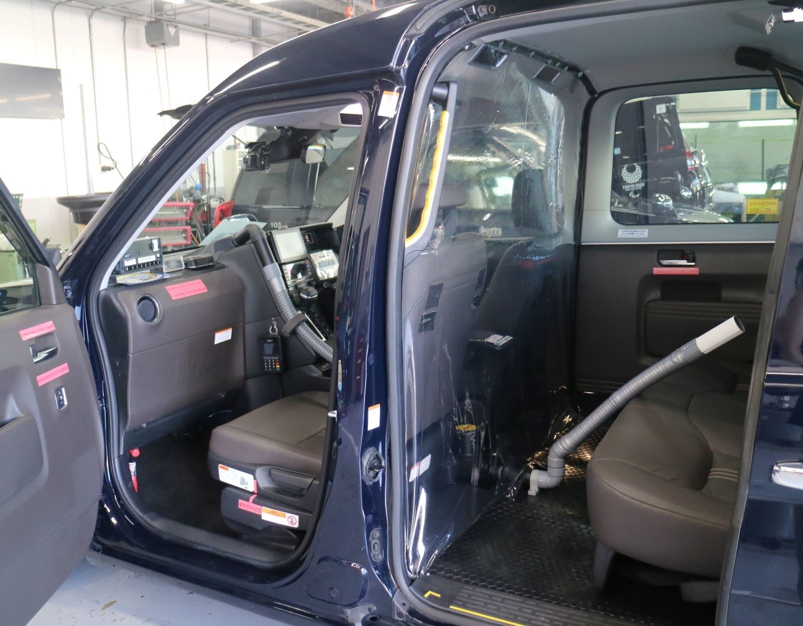 送迎に使用する車両は、トヨタが感染拡大の抑制や医療現場支援に向けて開発したキットを使用しています。トヨタ『JPN TAXI(ジャパンタクシー)』をベースに、運転席および助手席の車内前方と、後席の車内後方間に隔壁を設置し、後方の空気が前方に循環しないよう、前方を陽圧、後方を陰圧になるよう空気をコントロールします。また、専用のパイプを通して、車両前部にあるエアコンから、後席に冷気を送る仕組みです。送迎に使用する車両は、一般の営業は行わず、専用車両とします。感染拡大防止の観点から、乗務員は罹患者さまと接することのないよう、罹患者さまの乗降時は車内に留まらせていただきます。