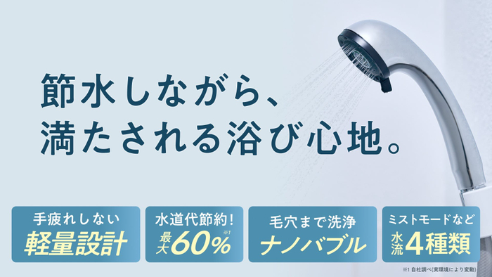 独自の爽快水流設計により、少ない水量でも広がりのある心地よい水流を実現。全身を包み込むように洗い流せるため、節水しながらも満足感のある浴び心地を叶えます。さらに水流モードを切り替えることで、水の使用量は最大約60%カット(※1)。毎日のシャワーで、水道代・ガス代の節約にもつながる、家計と環境にやさしい設計です。