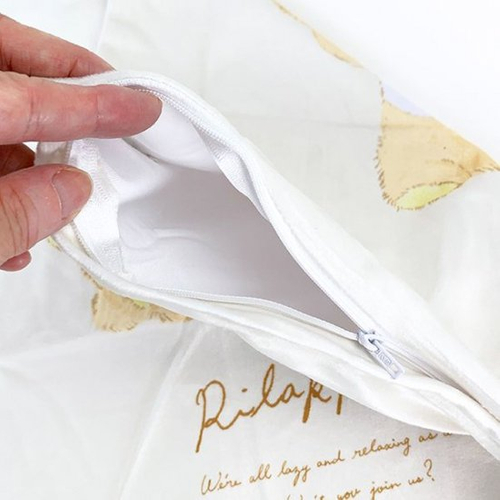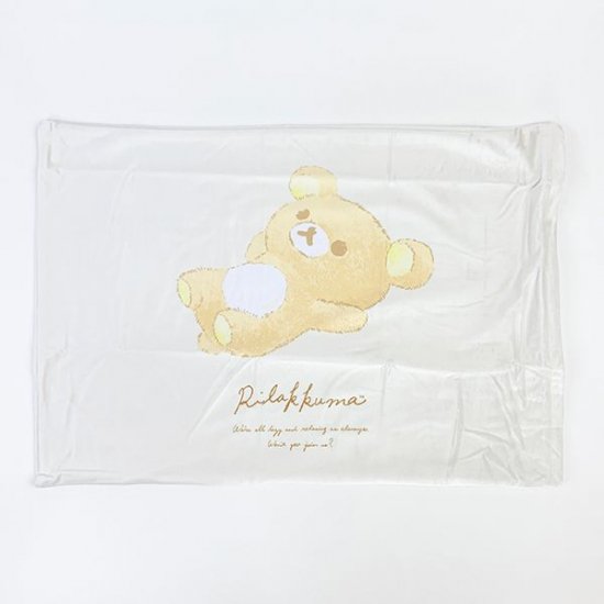 こちらはリラックマデザイン。ベージュカラーのシンプルな背景にリラックマがのびのびとくつろいでいます。何を考えているのかな?リラックマ単体にロゴデザインのシンプルな枕カバーです♪これなら大人も使いやすいですね。