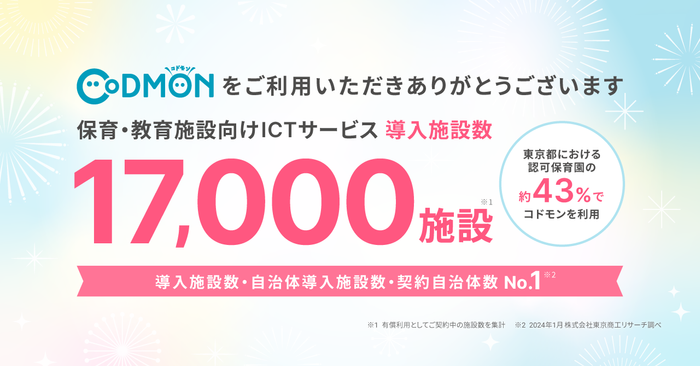 株式会社コドモン(本社:東京都港区、代表取締役:小池義則)は、当社が展開する保育・教育施設向けICTサービス「CoDMON」(以下:コドモン)の有償利用での導入施設数が、2024年1月5日(金曜日)に17,000施設※1を超えたことをお知らせいたします。2023年10月26日の16,000施設から約2ヶ月で新たに1,000以上の施設に新規導入されました。東京都における認可保育園の42.62%※2で導入されており、公立施設※3においては全国482自治体での導入が決定いたしました。