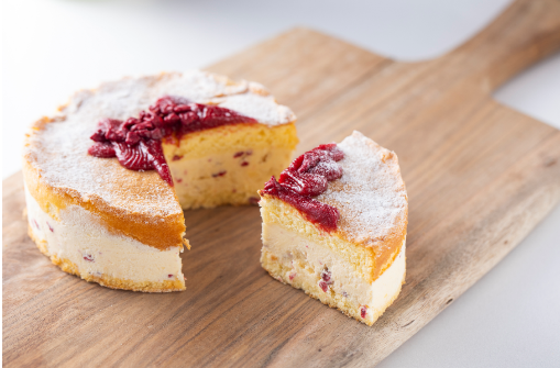ジャージー牛乳から作られたバタークリームをアーモンドが香る生地でサンドしました。甘酸っぱいラズベリーをトッピングした、ふわっととろける食感のケーキです。