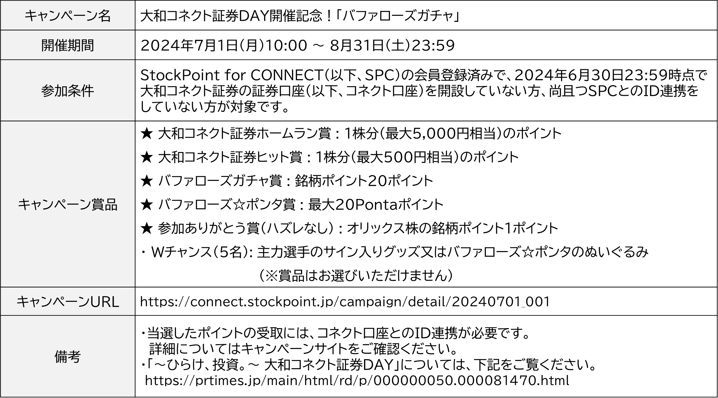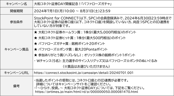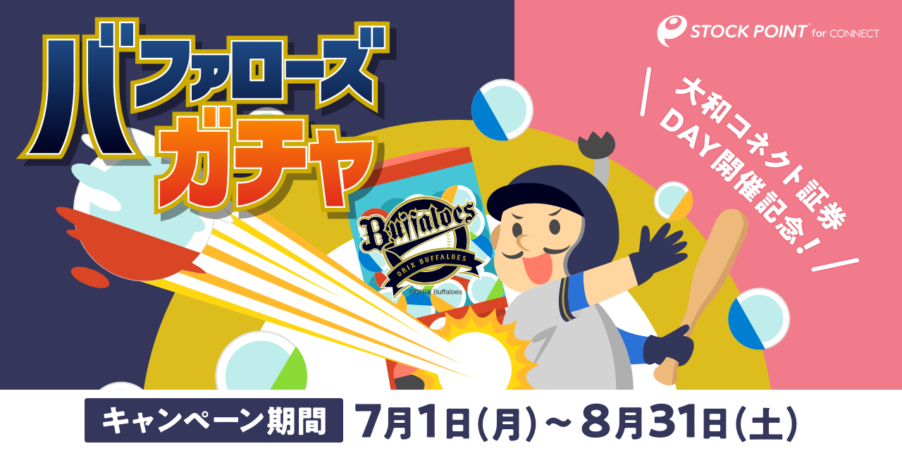 STOCK POINT株式会社(本社:東京都港区、代表取締役社長:美好琢磨)は、大和コネクト証券株式会社(本社:東京都中央区、代表取締役社長:大槻 竜児、以下「大和コネクト証券」)と提供しているポイント運用アプリ「 StockPoint for CONNECT」にて、オリックス・バファローズ スポンサー冠試合「~ひらけ、投資。~ 大和コネクト証券DAY」の開催を記念し、期間限定「バファローズガチャ」を開催いたします。