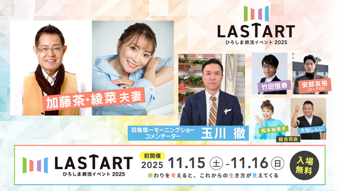 人生100年時代。いまや「終活」はシニア世代だけでなく、家族全員で向き合うテーマになりつつあります。広島ホームテレビは、2025年11月15日(土)・16日(日)の2日間、広島県立広島産業会館 西展示館にて、西日本最大級の終活イベント、「LASTARTひろしま終活イベント2025」を開催します。終わりを考えると、これからの生き方が見えてきます。「家族と一緒に未来を考える」きっかけとなる場を目指します。