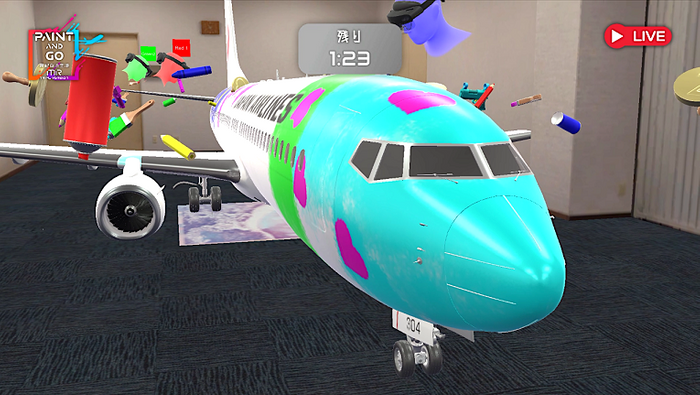 MRグラスを装着した参加者達の目の前に、1/4.2スケールの3D飛行機が現れ、飛行機の形を感じながらクレヨンやスプレーなどを使って自由に機体にペイントを施します。参加者それぞれのペイントした情報が、ローカル5Gを介して低遅延で同期することにより、お互いのペイントの様子がリアルタイムに確認できるため、参加者全員で協力しながら1つのオリジナル飛行機作りを楽しむことができます。