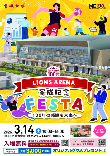【名城大学】3/14に開学100周年記念アリーナ完成記念イベント「LIONS ARENA 完成記念 FESTA―100年の感謝を未来へ―」を開催