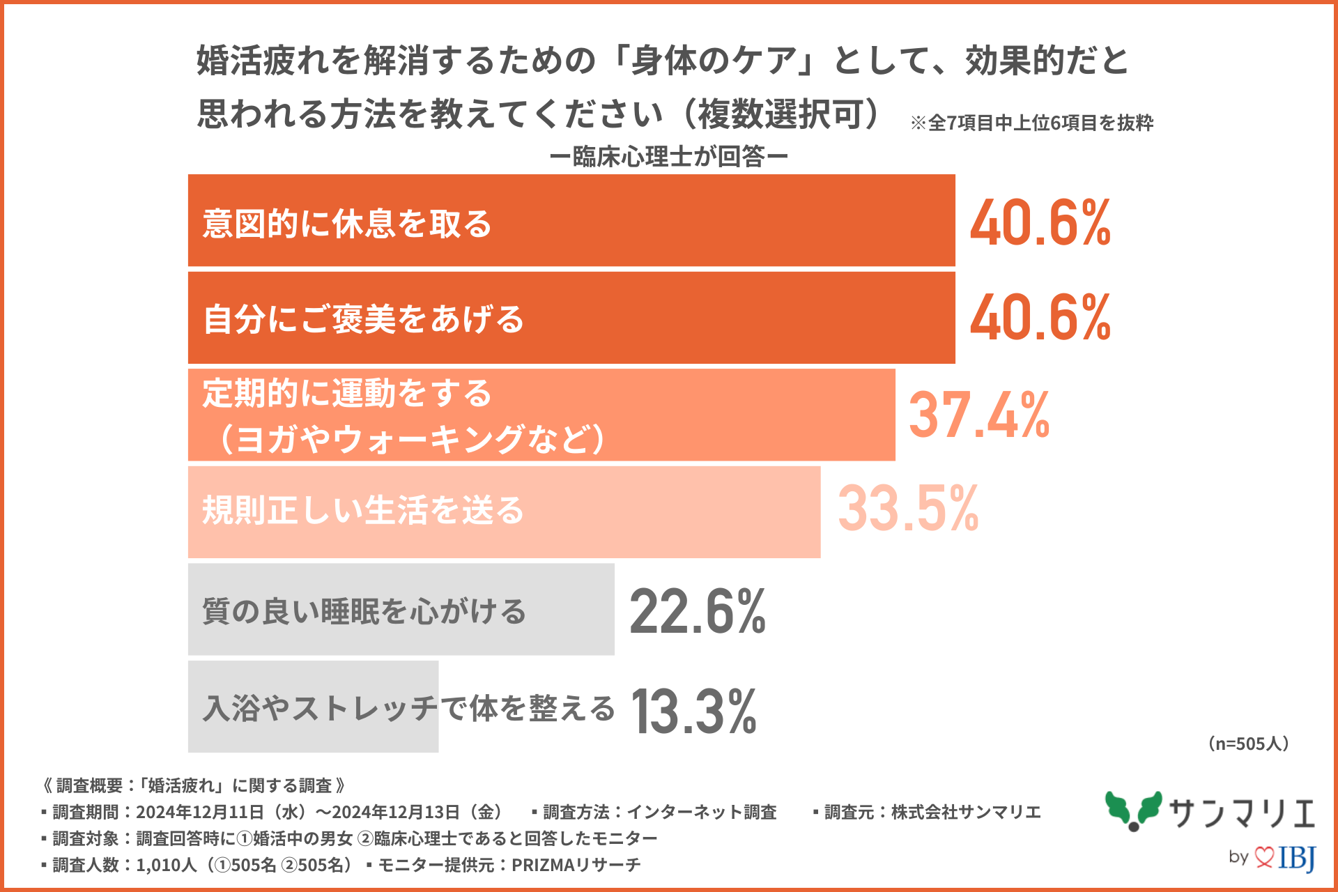 「婚活疲れを解消するための「身体のケア」として、効果的だと思われる方法を教えてください(複数選択可)」と質問したところ、『意図的に休息を取る(40.6%)』『自分にご褒美をあげる(40.6%)』が同数になり、次いで『定期的に運動をする(ヨガやウォーキングなど)(37.4%)』『規則正しい生活を送る(33.5%)』となりました。