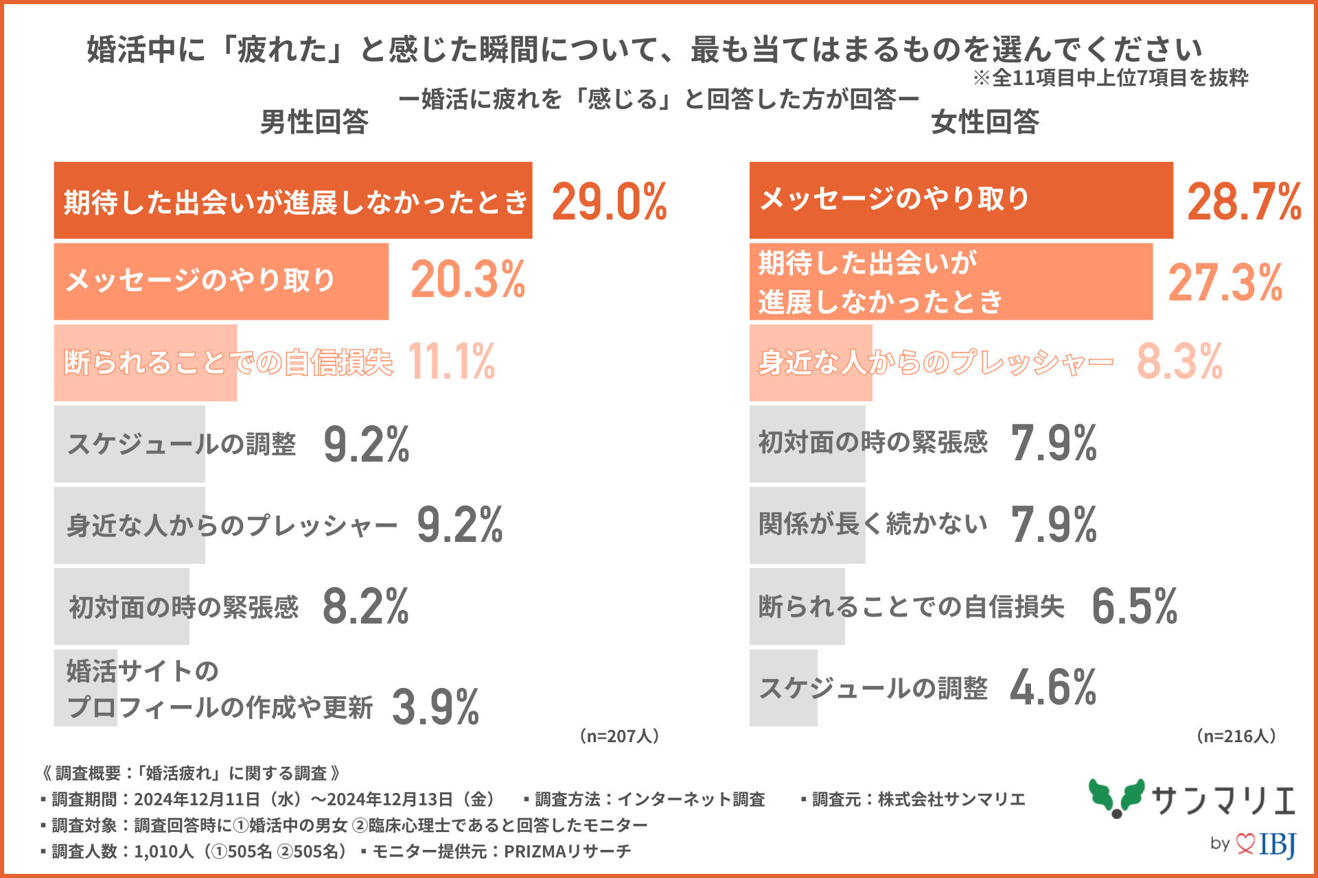 婚活疲れの主な要因として、男性は「期待した出会いが進展しなかったとき」、女性は「メッセージのやり取り」が最多になり、婚活の進展に対する焦りや、相手とのコミュニケーションにおける負担が大きいことがうかがえます。