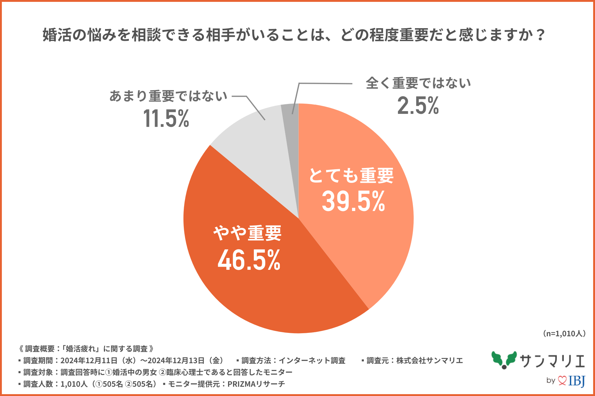 全員に、「婚活の悩みを相談できる相手がいることは、どの程度重要だと感じますか?」と質問したところ、約9割の方が『とても重要(39.5%)』『やや重要(46.5%)』と回答しました。