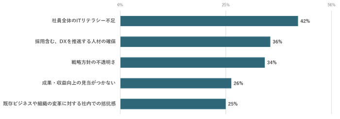 DX推進の障壁について、最も回答が多かったのは「社員全体のITリテラシー不足」で42%、ついで「採用含む、DXを推進する人材の確保」が36%、「戦略方針の不透明さ」が34%と続く結果となりました。専門人材の確保よりも、会社全体のITリテラシーの向上がDXにおいて重要なファクターであることが分かりました。