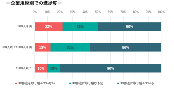 回答いただいた媒体社のうち、DXに「取り組んでいる」と回答した企業は55%、「取り組む予定」まで含めると81%となりました。企業規模別で比較すると、DXに取り組む媒体社は、従業員数1000人以上では8割にのぼる一方で、1000人未満の場合は約5割にとどまっており、企業規模によってDX推進の進捗度に大きな開きが生じていることが分かりました。